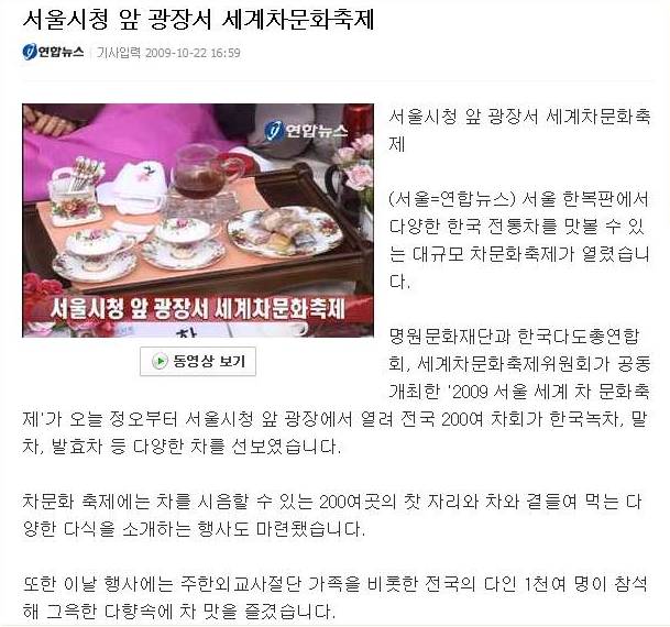 2009년 서울 세계차 문화축제가 10월22일 서울시청 앞 잔디광장에서 전국의 다인과 서울시민, 외국인이 참가한 가운데 성황리에 개최되었다. 600년을 넘은 대한민국의 수도 서울시 시청광장에서 한국 전통문화의 총체라 할 수 있는 전통다례와 우리 茶문화의 계승과 보급을 위해 이번 축제를 개최함으로써, 우리나라 문화의 우수성과 전통성, 역사성을 잇는 계기를 마련하였다.